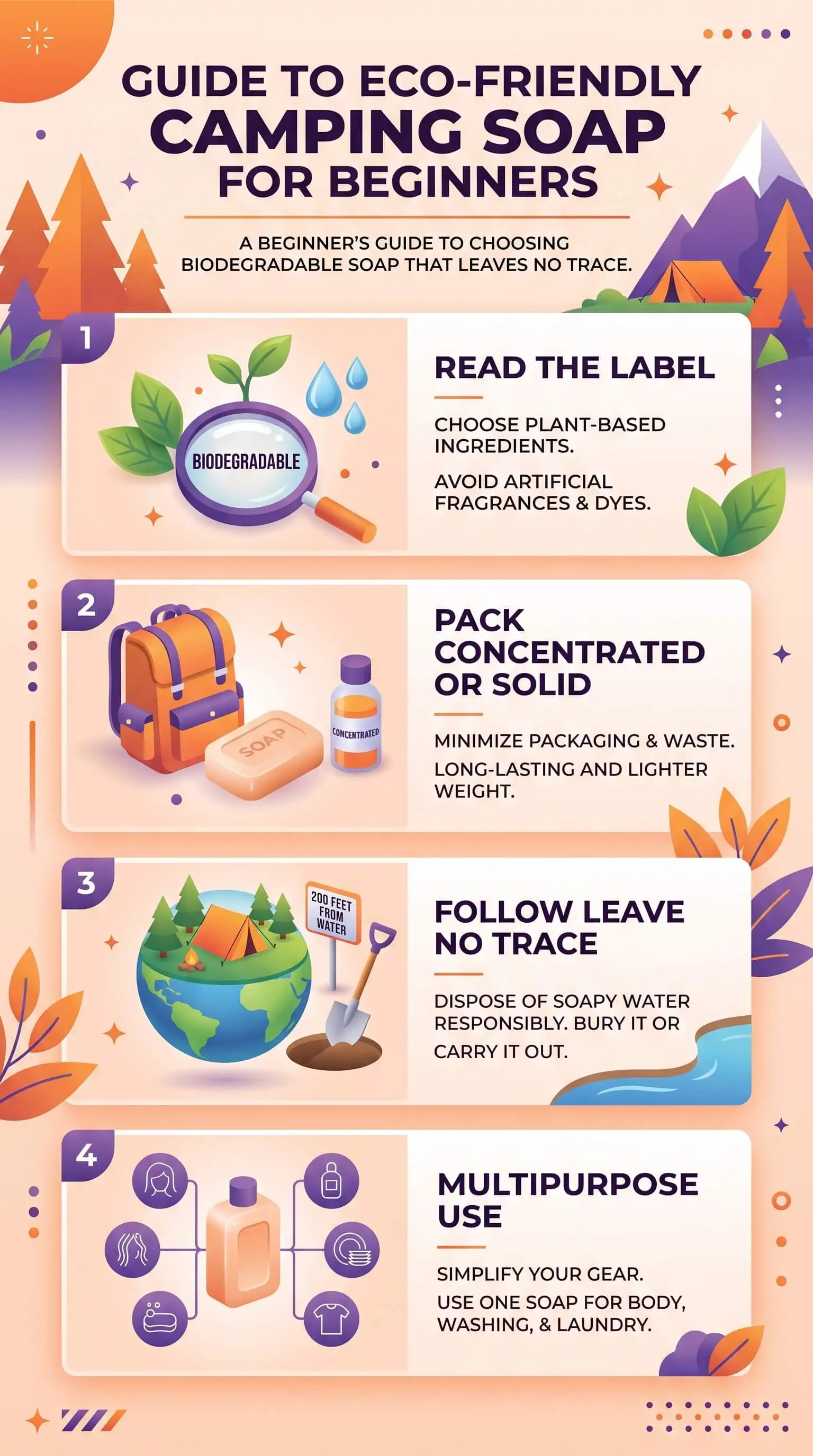 If you want a soap built around the standards covered above (concentrated, plant-based, phosphate-free, and designed specifically for camp use), look for brands that specialize in biodegradable outdoor soap rather than generic "natural" body wash that happens to come in a green bottle, a mindset that aligns closely with principles of sustainable agriculture. My opinion, based on what I've seen across hundreds of campsites: use one multi-use bottle, pack a 1-liter rinse basin, and count out your 70 steps every single time. Do that and you're already camping better than most of the people around you.